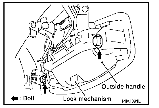 9. Remove the outside handle mounting bolts, move the outside handle assembly backward, and then remove it from the pane- in front of the outside handle escutcheon.