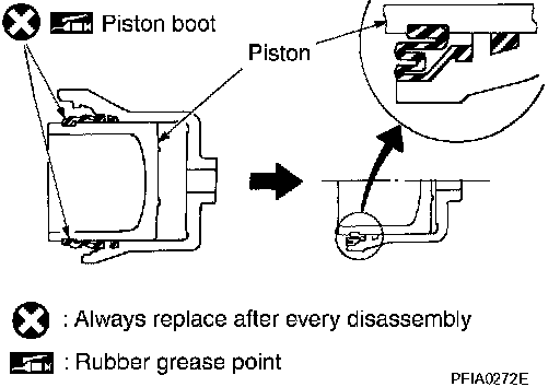 2. Apply rubber grease to piston boot. Cover the piston end with the piston boot, and then install cylinder slide lip on the piston boot securely into the groove on cylinder body.
