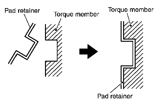 CAUTION: When attaching the pad retainer, attach it firmly so that it does not float up higher than the torque member, as shown in the figure.