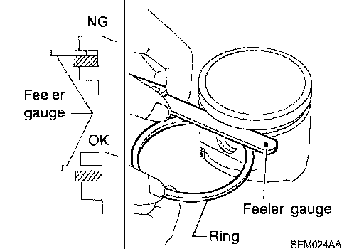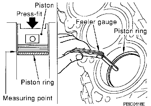 ^ Lubricate with new engine oil to piston and piston ring, and then insert piston ring until middle of cylinder with piston, and measure the piston ring end gap with feeler gauge.