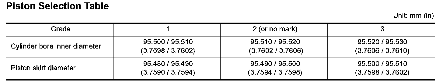 2. Determine the bore grade by comparing the measurement with the values under the cylinder bore inner diameter of the "Piston Selection Table".