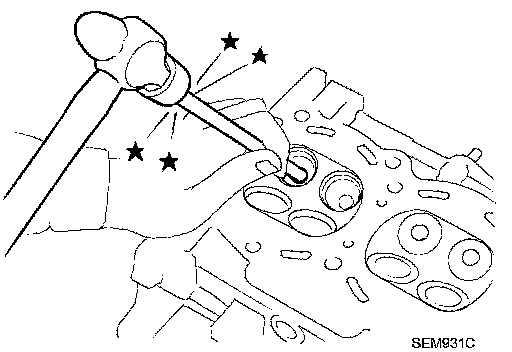 2. Drive out valve guide with a press [under a 20 kN (2 ton, 2.2 US ton, 2.0 Imp ton) pressure] or hammer and suitable tool.