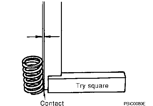 ^ Set try square along the side of valve spring and rotate spring. Measure the maximum clearance between the top face of spring and try square.