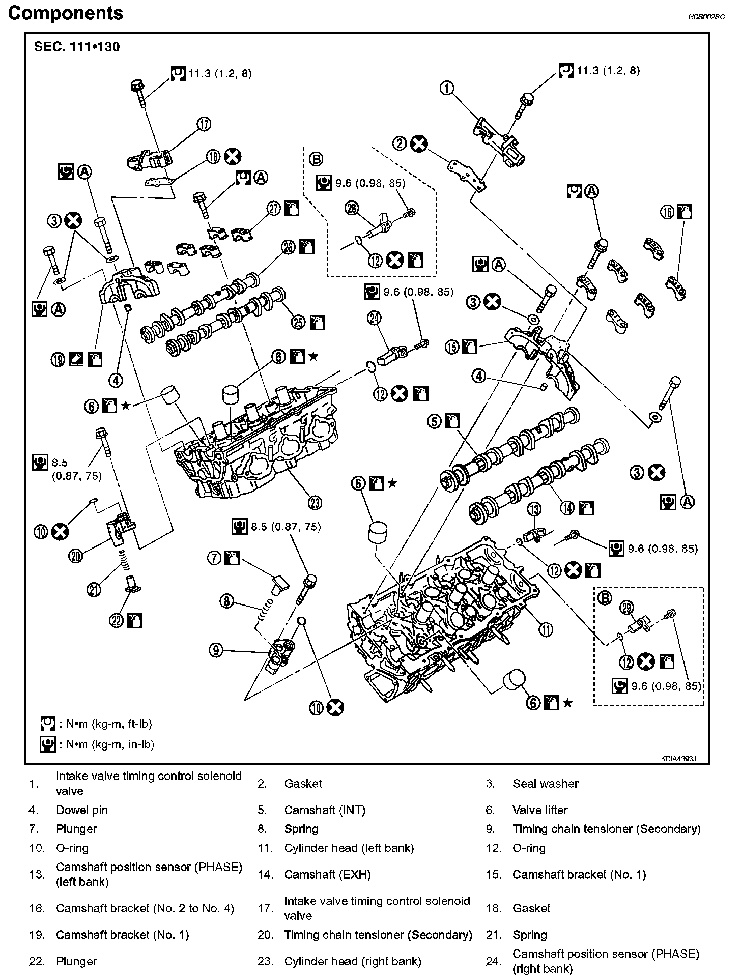 ^ For removal of timing chain tensioner (secondary), refer to EM-109, "CAMSHAFT". [Removing camshaft bracket (No. 1) is required.]