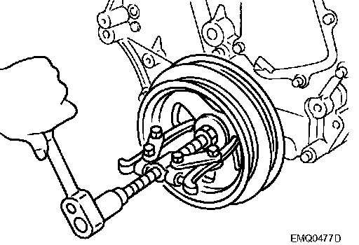 CAUTION: Do not put suitable puller tab on crankshaft pulley periphery, as this will damage internal damper.