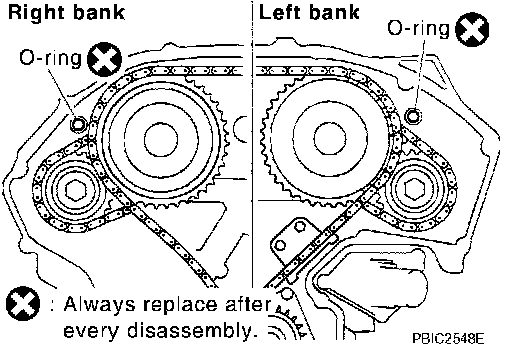 ^ During alignment, be careful to prevent dislocation of mating mark alignments of timing chains (secondary).