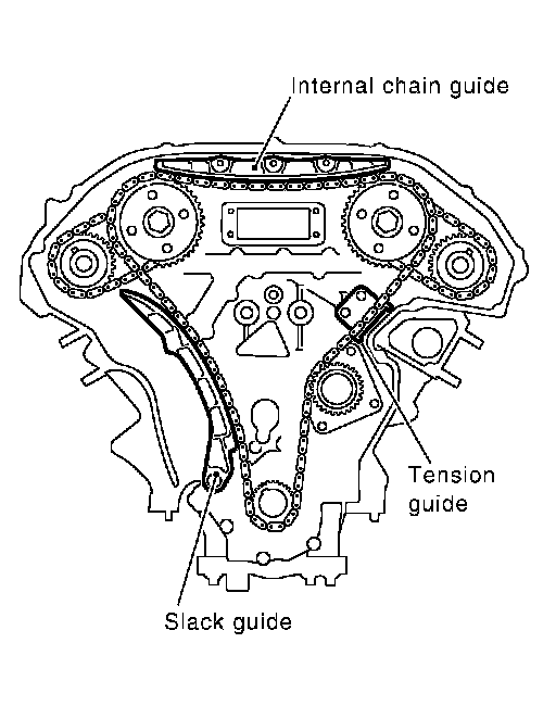 NOTE: If hydraulic pressure inside timing chain tensioner drops after removal/installation, slack in the guide may generate a pounding noise during and just after engine start. However, this is normal. Noise will stop after hydraulic pressure rises.