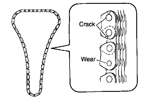 Check for cracks and any excessive wear at the roller links of timing chain. Replace timing chain as necessary.