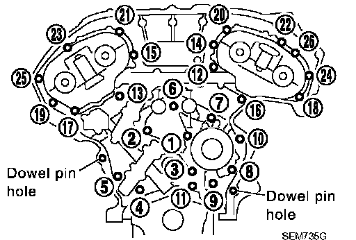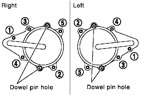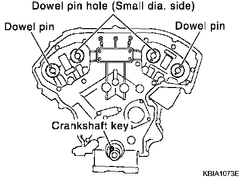 CAUTION: Hole on small dia. side must be used for intake side dowel pin hole. Do not misidentify (ignore big dia. side).