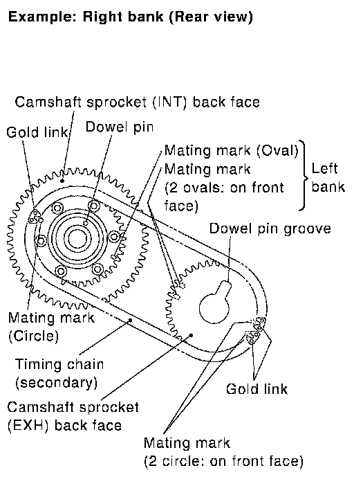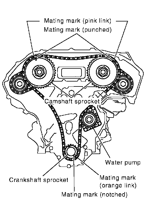 NOTE: The figure shows the relationship between the mating mark on each timing chain and that on the corresponding sprocket, with the components installed.