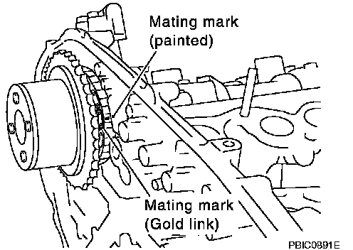 CAUTION: Mating marks between timing chain and sprockets slip easily. Confirm all mating mark positions repeatedly during the installation process.