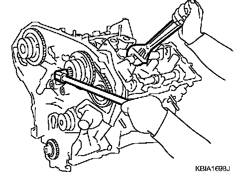 CAUTION: Do not loosen mounting bolts with securing anything other than the camshaft hexagonal portion or with tensioning the timing chain.