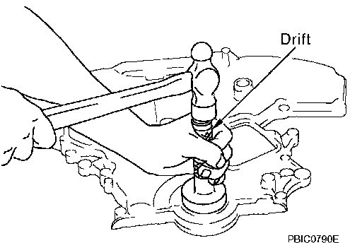 ^ Using suitable drift, press-fit oil seal until it becomes flush with front timing chain case end face.