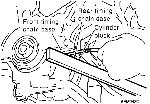34. Use scraper to remove all traces of old liquid gasket from front and rear timing chain cases, and opposite mating surfaces.