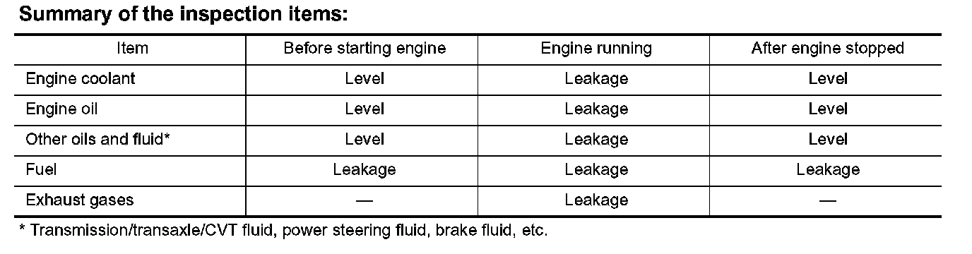 ^ Warm up engine thoroughly to make sure there is no leakage of fuel, exhaust gases, or any oil/fluids including engine oil and engine coolant.