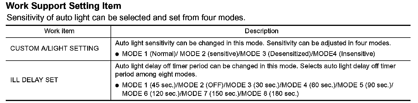 3. Touch "CUSTOM A/LIGHT SETTING" or "ILL DELAY SET" on "SELECT WORK ITEM" screen.