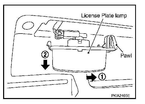 1. While pressing pawl on reverse side, push license plate towards you to remove.