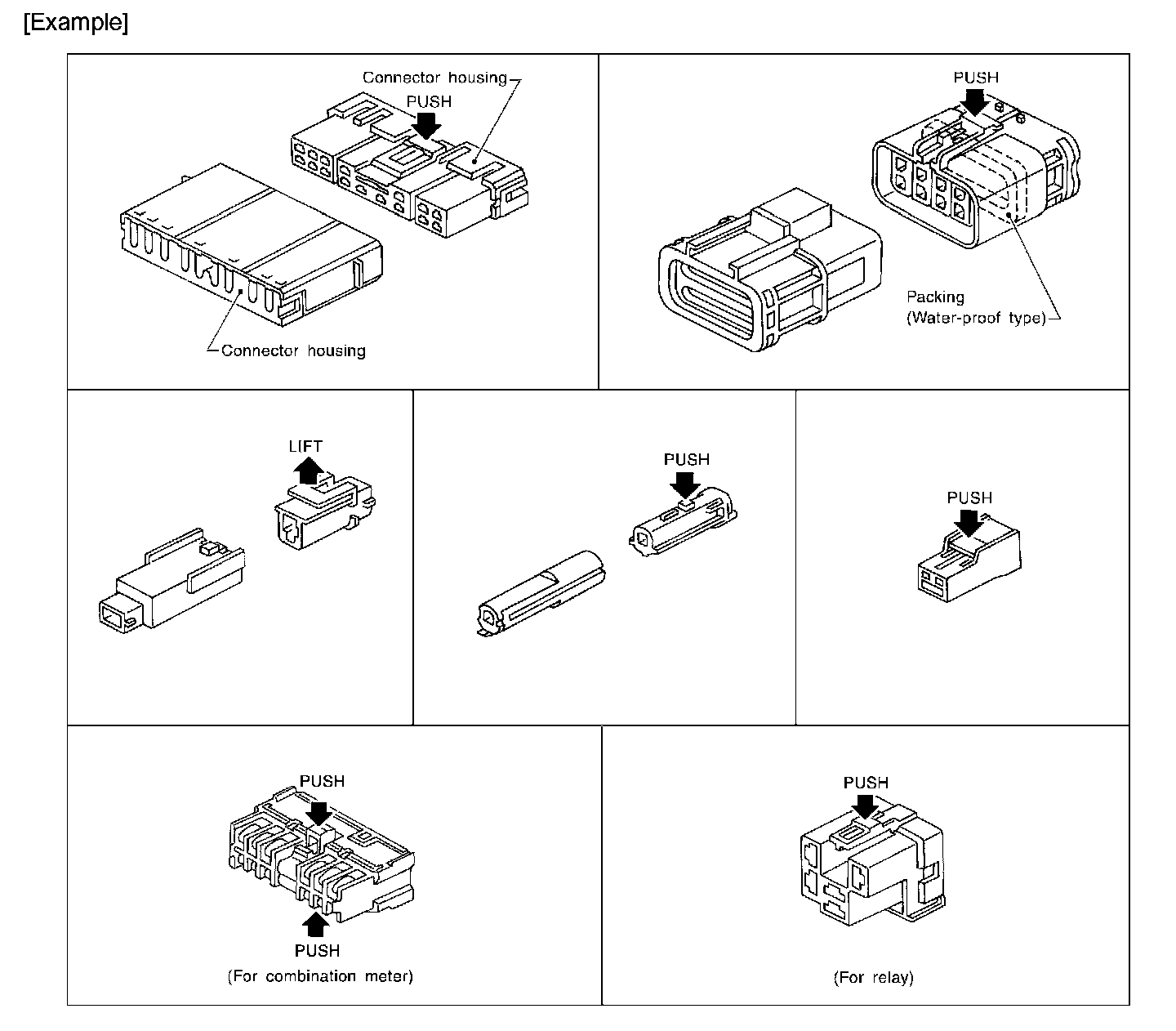 - The tab-locking type connectors are disconnected by pushing or lifting the locking tab(s). Refer to the figure.