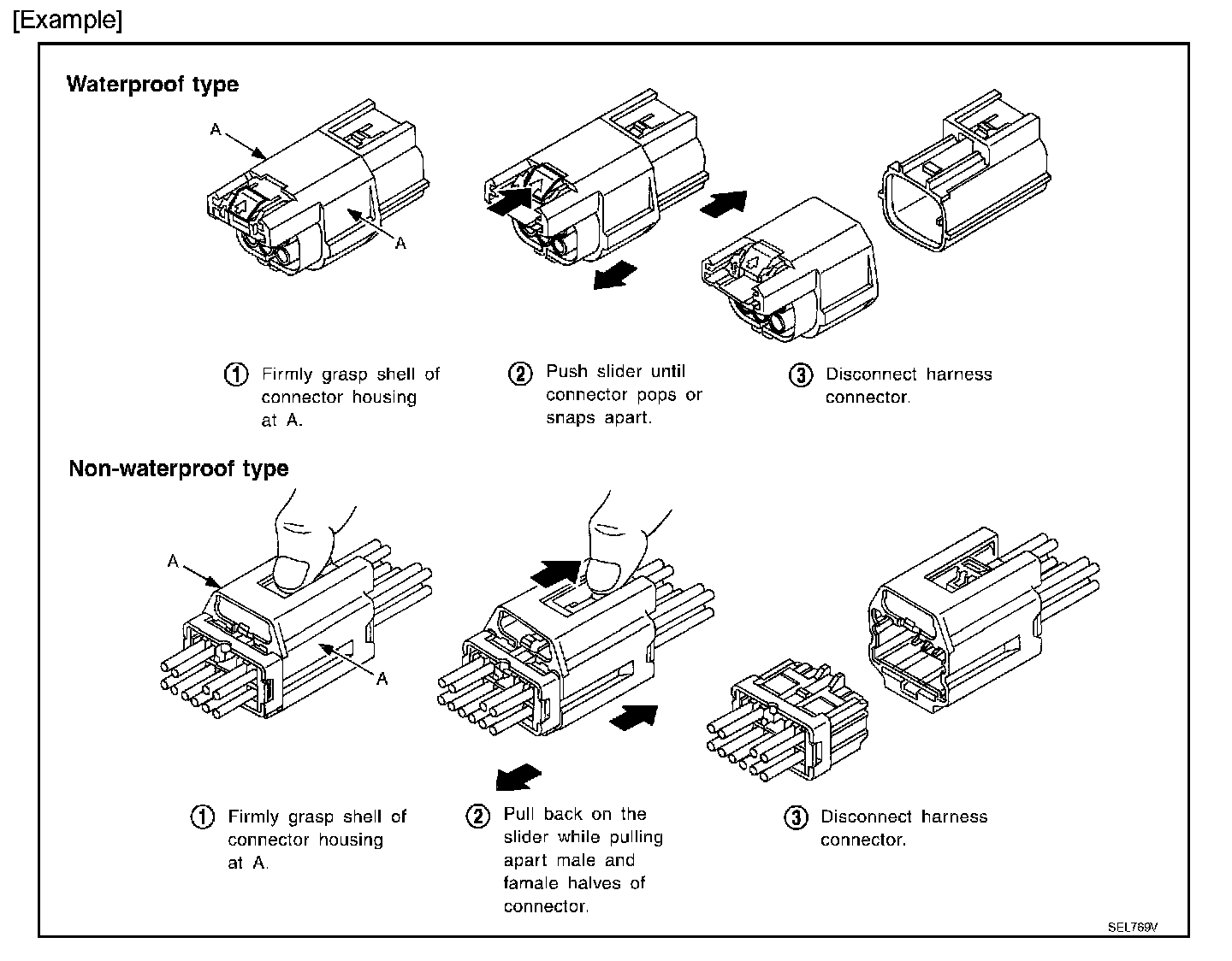 - Never pull the harness or wires when disconnecting the connector.
