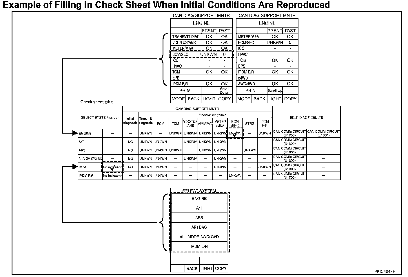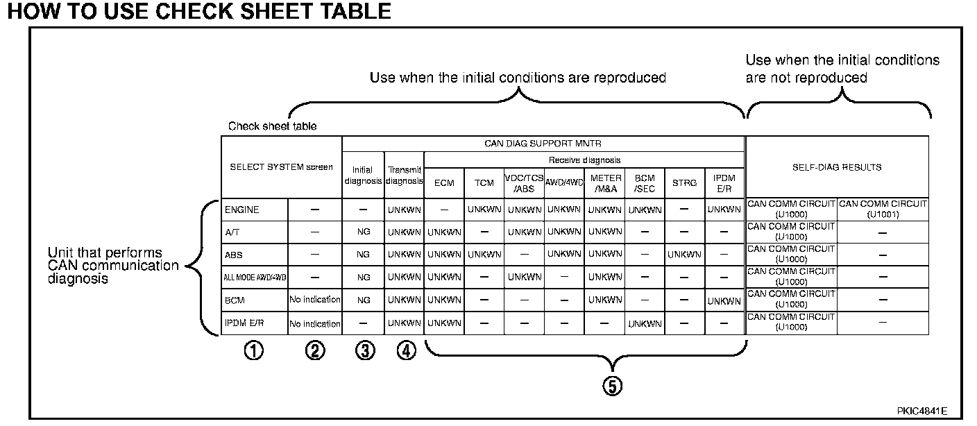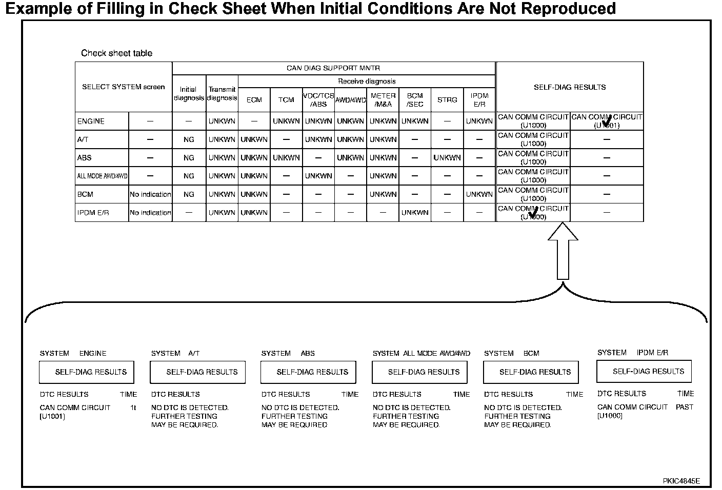 NOTE: There is a case that some of "CAN DIAG SUPPORT MNTR" and "SELF-DIAG RESULTS" are not needed for diagnosis. In the case, "UNKWN" and "CAN COMM CIRCUIT [U1000]" in "Check sheet results (example)" change to "-". Then, ignore check marks on the check sheet table.