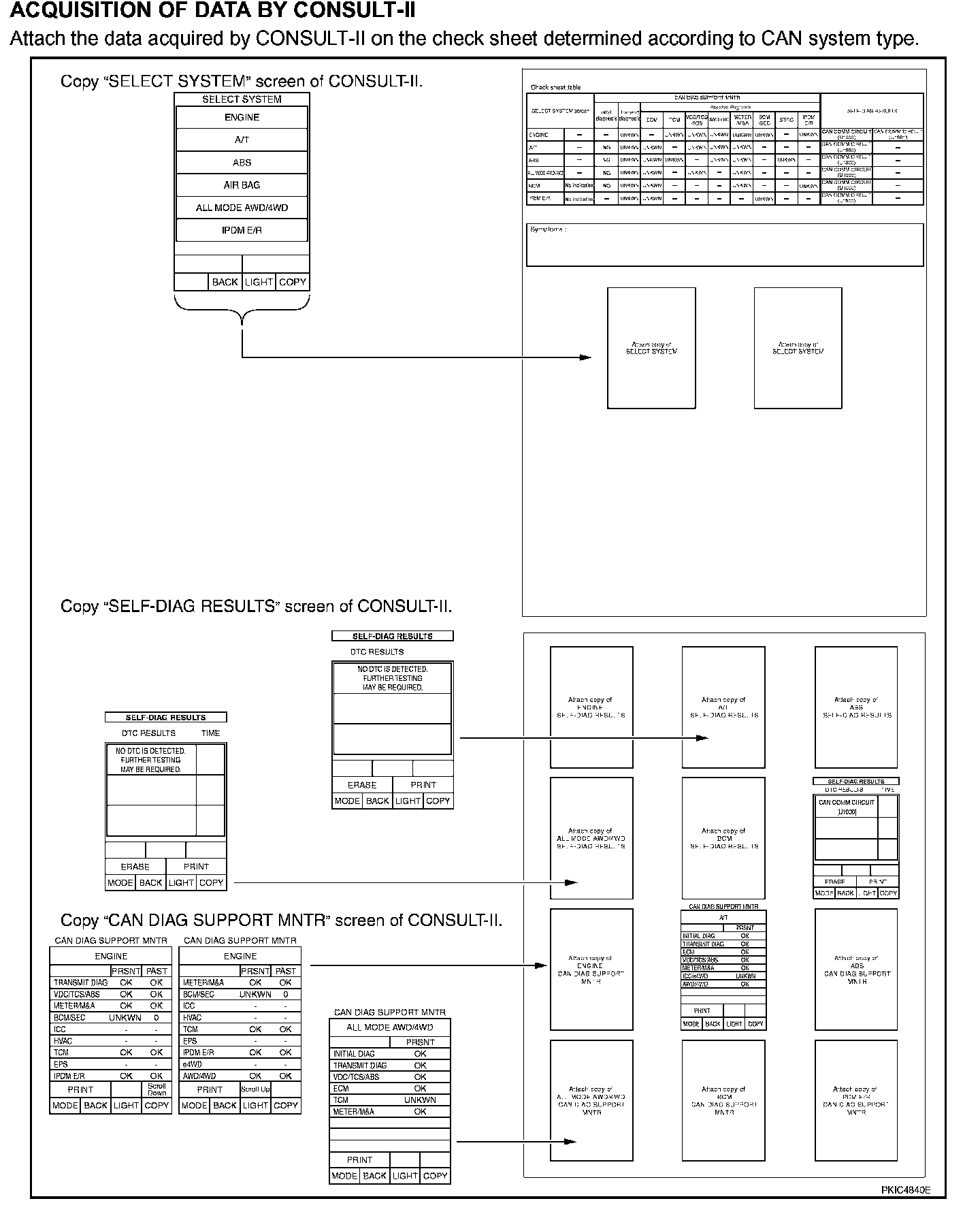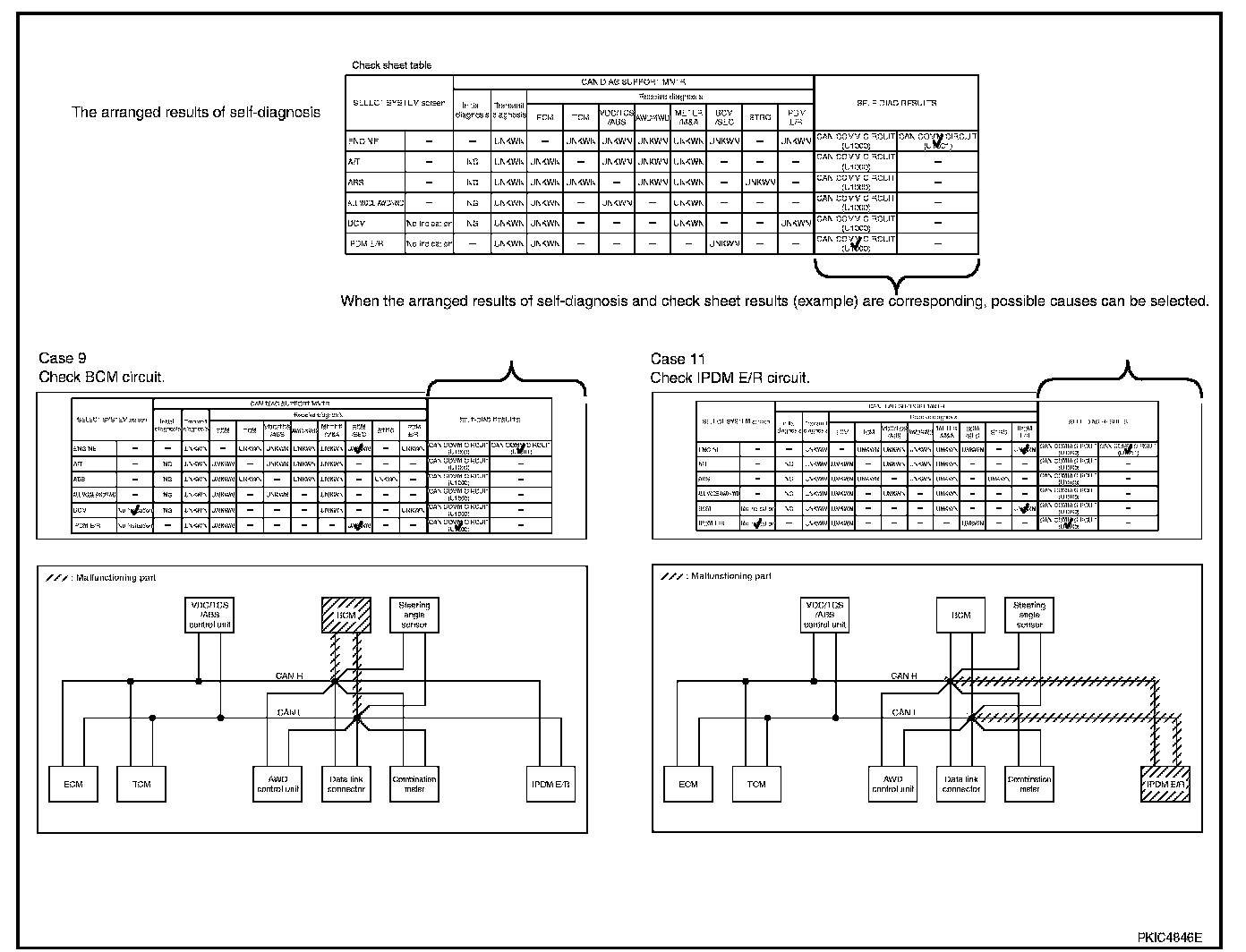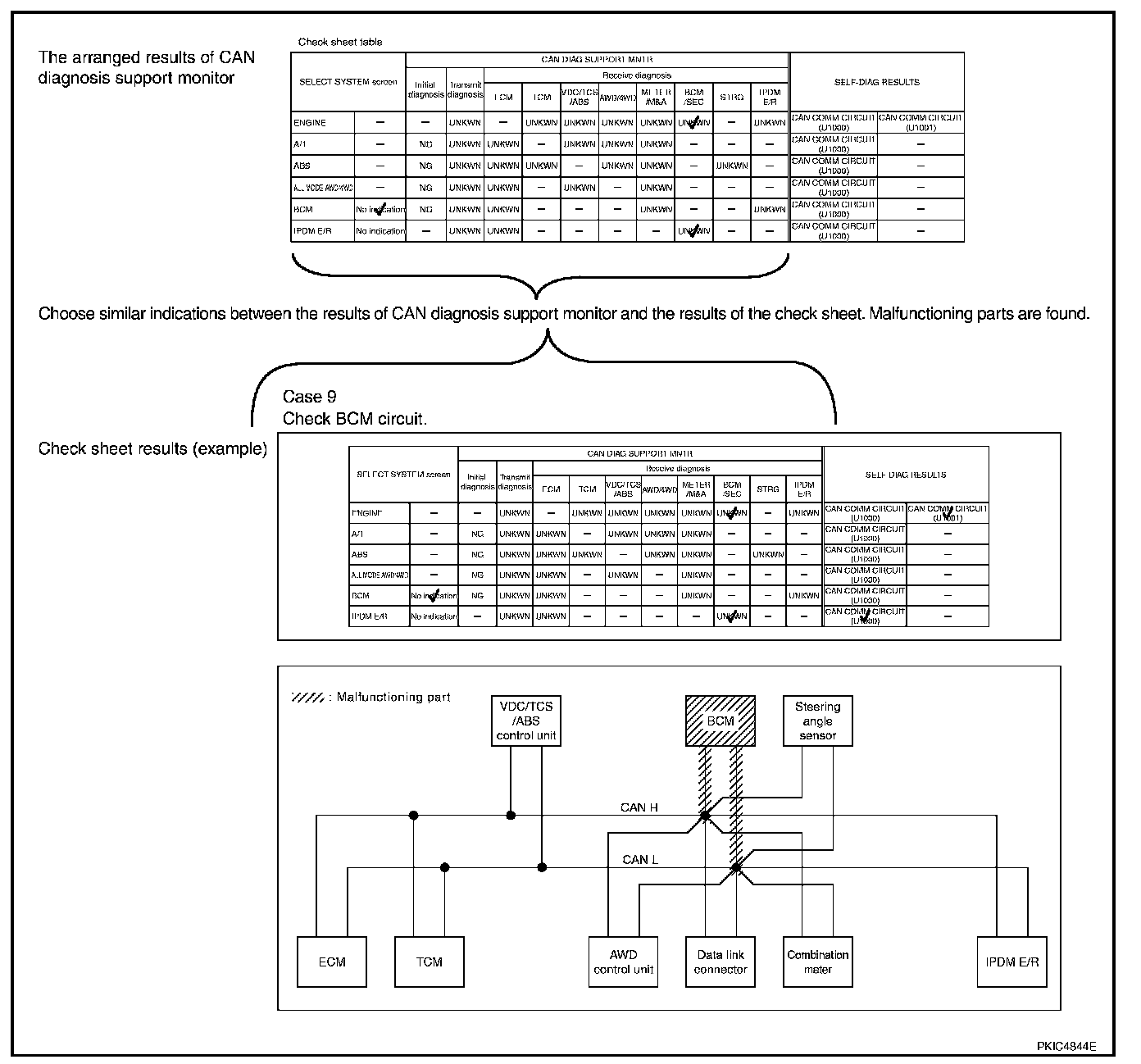 NOTE: There is a case that some of "CAN DIAG SUPPORT MNTR" and "SELF-DIAG RESULTS" are not needed for diagnosis. In the case, "UNKWN" and "CAN COMM CIRCUIT [U1000]" in "Check sheet results (example)" change to "-". Then, ignore check marks on the check sheet table.