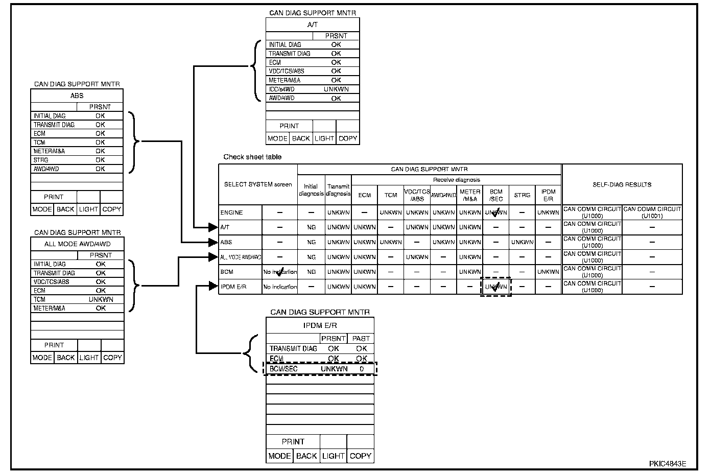 3. Confirm the unit name that "UNKWN" is displayed on the copy of "CAN DIAG SUPPORT MNTR" screen of "A/T", "ABS", "ALL MODE AWD/4WD" and "IPDM E/R" as well as "ENGINE". And then, put a check mark to the check sheet table.
