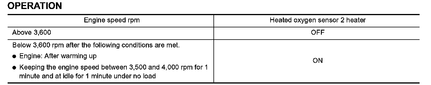 The ECM performs ON/OFF control of the heated oxygen sensor 2 heater corresponding to the engine speed, amount of intake air and engine coolant temperature.