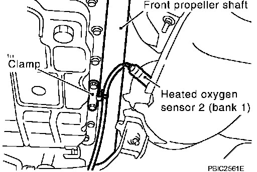 The section of the harness between heated oxygen sensor 2 (bank 1) and the clamp should be installed tensely due to the secure clearance with front propeller shaft.