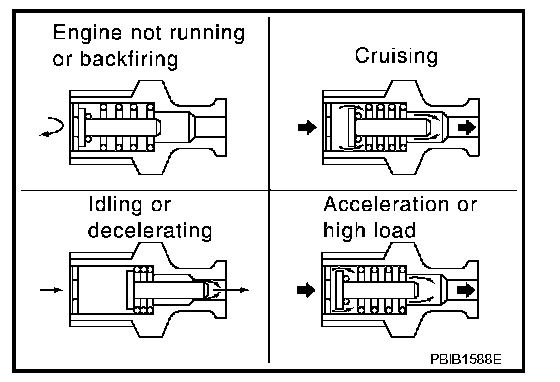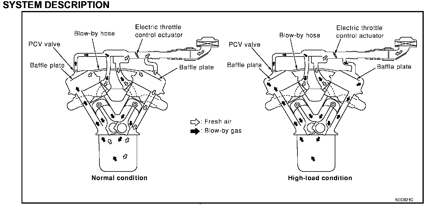 The positive crankcase ventilation (PCV) valve is provided to conduct crankcase blow-by gas to the intake manifold. During partial throttle operation of the engine, the intake manifold sucks the blow-by gas through the PCV valve. Normally, the capacity of the valve is sufficient to handle any blow-by and a small amount of ventilating air. The ventilating air is then drawn from the air inlet tubes into the crankcase. In this process the air passes through the hose connecting air inlet tubes to rocker cover. Under full-throttle condition, the manifold vacuum is insufficient to draw the blow-by flow through the valve. The flow goes through the hose connection in the reverse direction.