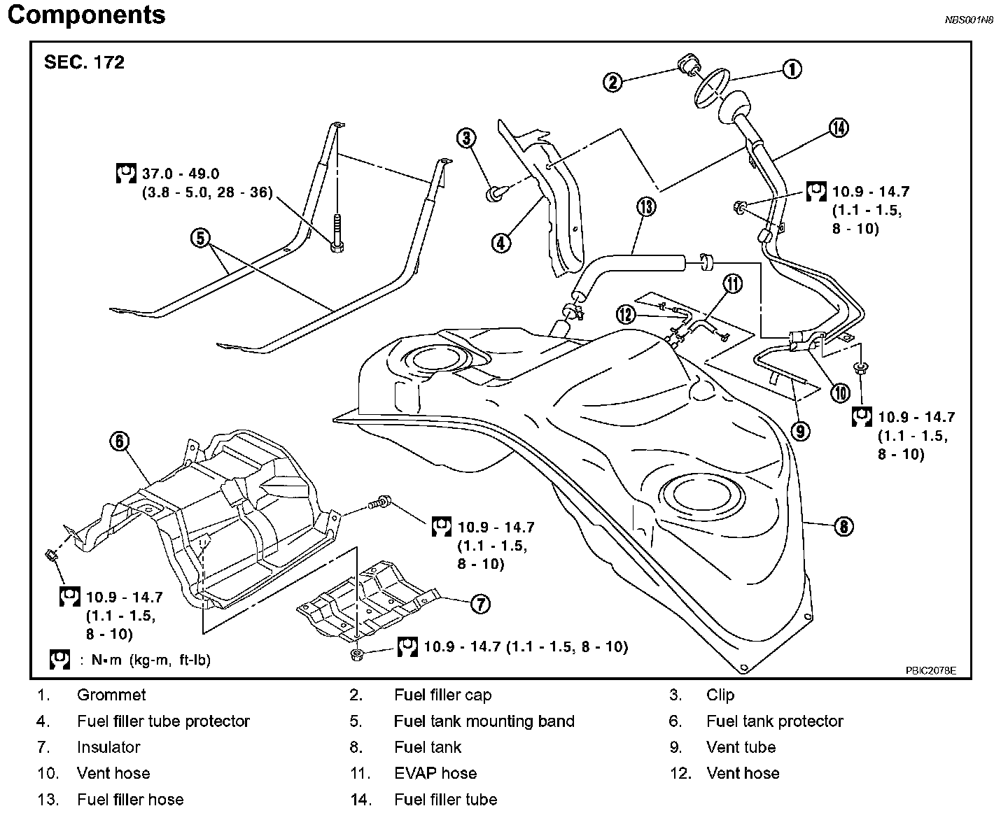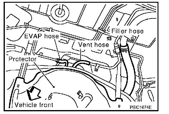 7. Disconnect fuel filler hose, vent hose and EVAP hoses at fuel tank side.