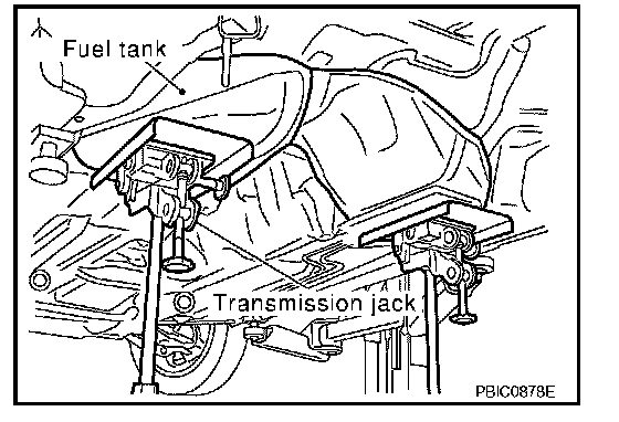 8. Remove fuel tank mounting band bolts while supporting fuel tank.