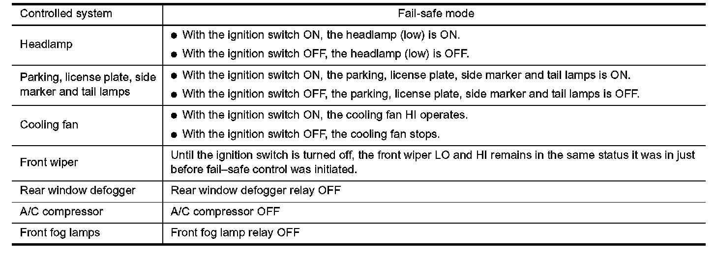 - Operation of control parts by IPDM E/R during fail-safe mode is as shown in the table.