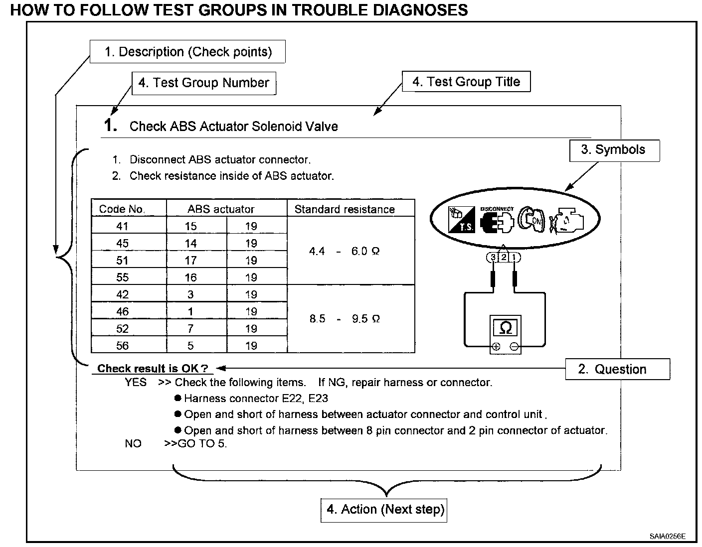 Next action for each test group is indicated based on result of each question. Test group number is shown in the left upper portion of each test group.