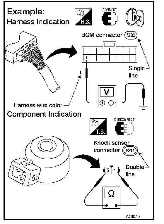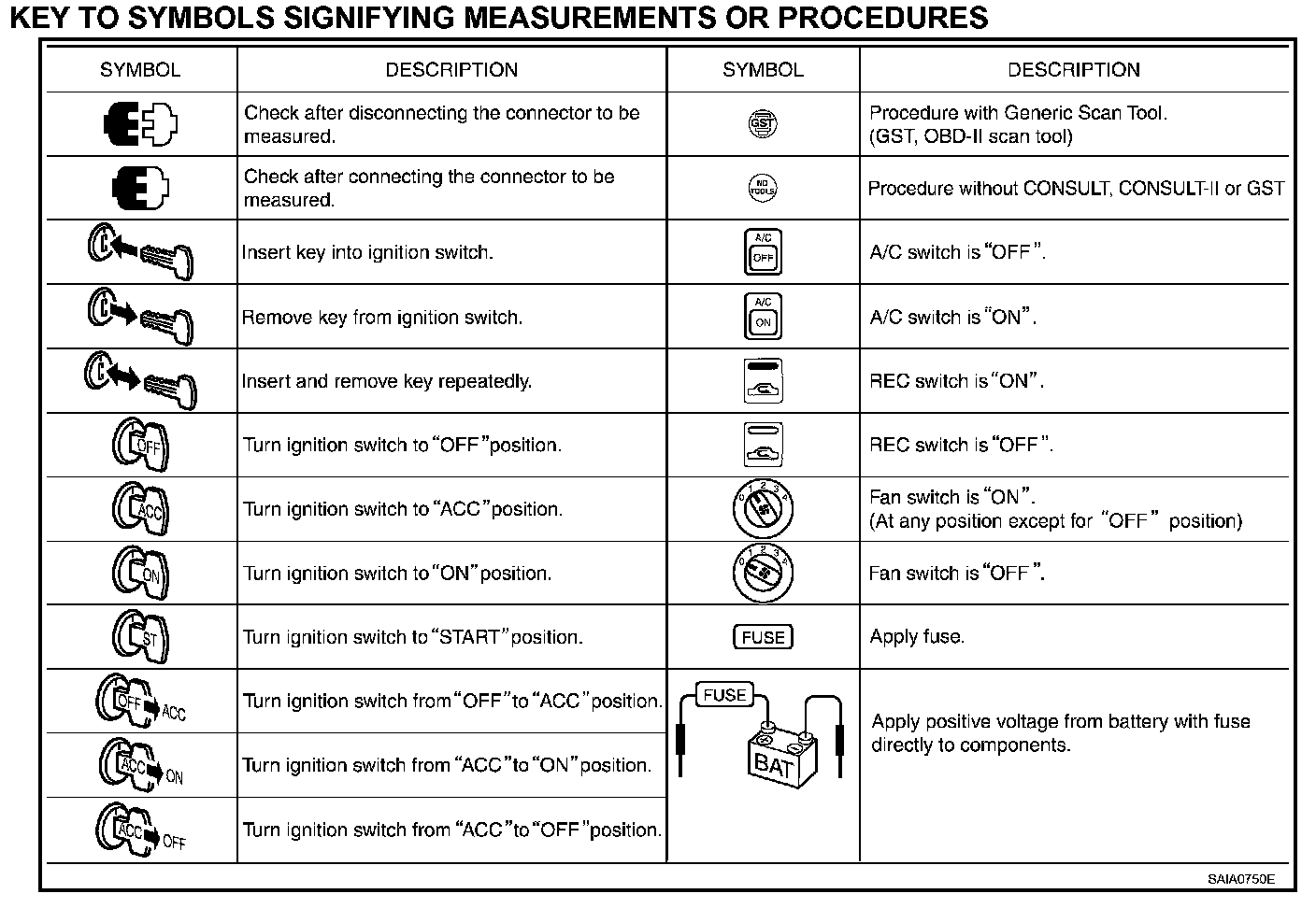 Symbols included in illustrations refer to measurements or procedures. Before diagnosing a problem, familiarize yourself with each symbol. Refer to "Connector Symbols" and "KEY TO SYMBOLS SIGNIFYING MEASUREMENTS OR PROCEDURES".