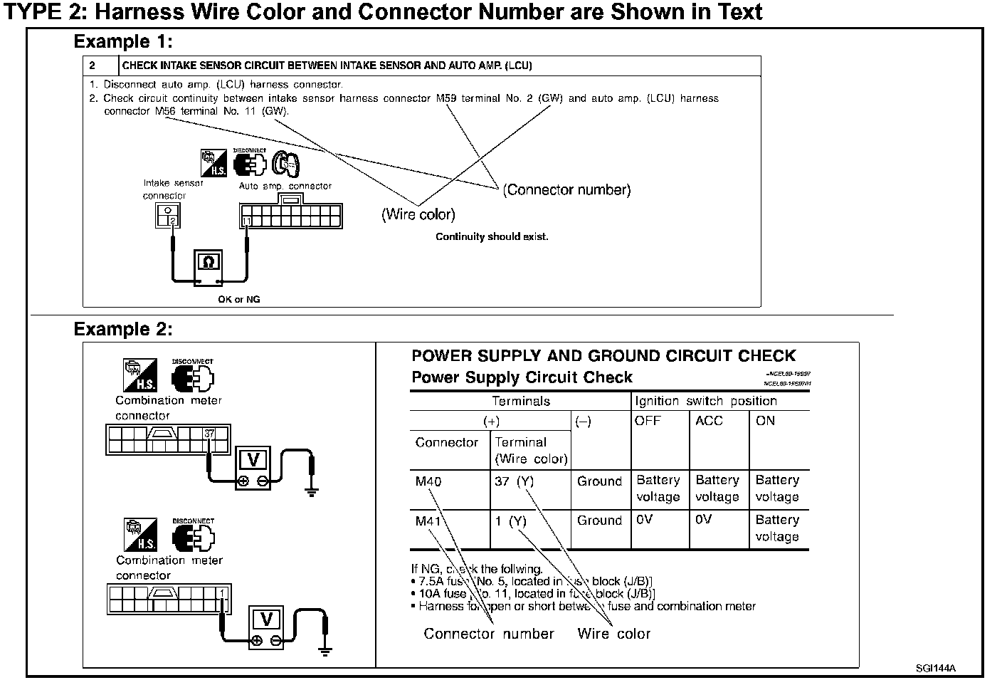 TYPE 2: Harness Wire Color and Connector Number are Shown in Text