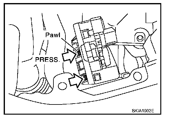 2. Remove IPDM E/R cover A. While pushing pawl on backside of IPDM E/R cover B toward vehicle front to unlock, lift up IPDM E/R.