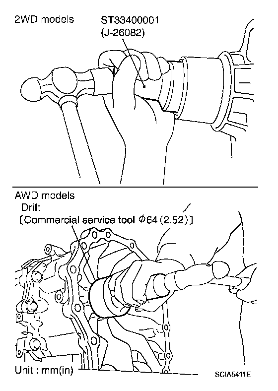 1. As shown in the figure, use the drift to drive rear oil seal into rear extension assembly (2WD models) or adapter case assembly (AWD models) until it is flush.