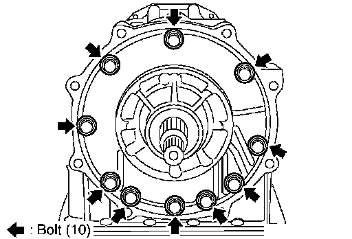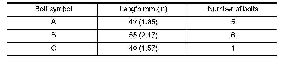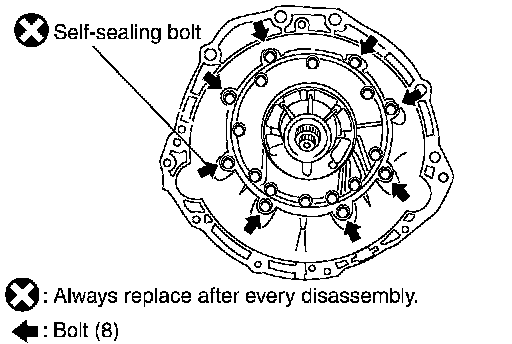 7. Install converter housing to transmission case, and then tighten converter housing mounting bolts to the specified torque. Refer to AT-265, Components.