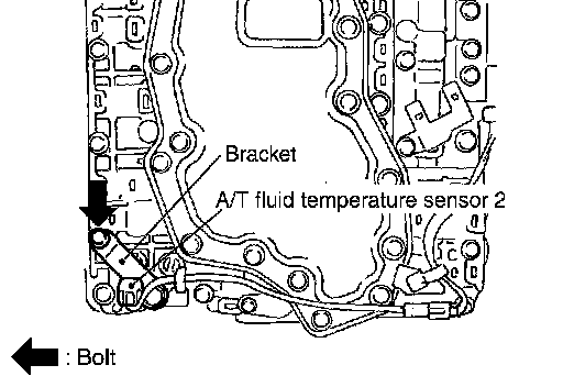 f. Install A/T fluid temperature sensor 2 (with bracket) in control valve with TCM, and then tighten A/T fluid temperature sensor 2 mounting bolt to the specified torque. Refer to AT-265, Components.