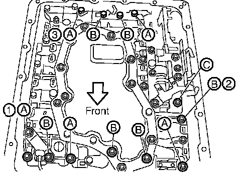 h. Install bolts A, B and C to control valve with TCM.