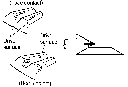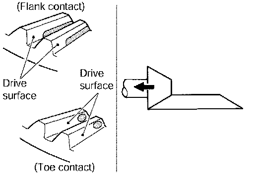 ^ If the tooth contact is near the flank (flank contact), or near the toe (toe contact), thin pinion height adjusting washers to move drive pinion farther from drive gear.