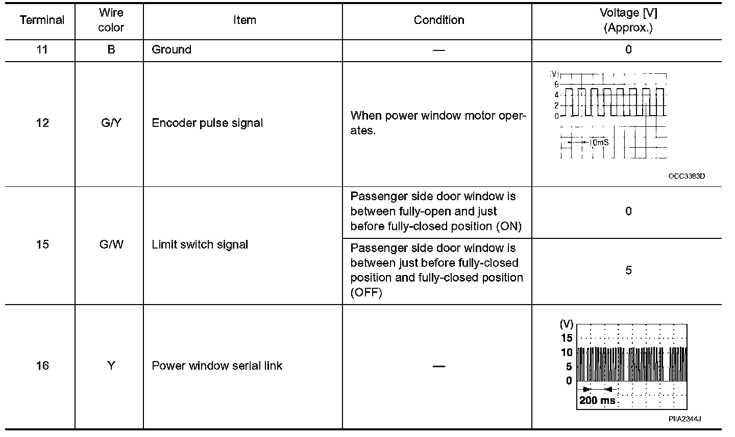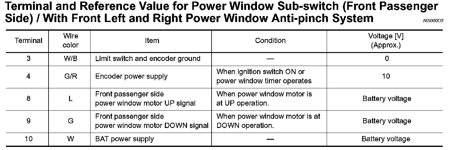 Terminal And Reference Value For Power Window Sub - Switch (Front Passenger Side) / With Front Left And Right Power Window Anti - Pinch System: