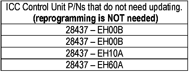 If your vehicle has had the ICC control unit replaced recently or this campaign has already been performed your part number will be one of these. If your part number matches one of these reprogramming is NOT needed this procedure is complete. No Further Action is Necessary.