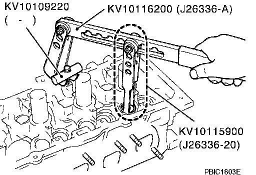 ^ Compress valve spring with the valve spring compressor, the attachment and the adapter [SST]. Install valve collet with a magnet hand.