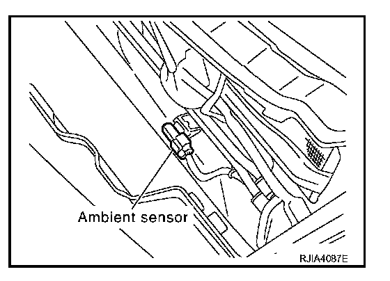 The ambient sensor is attached on the radiator core support (left side). It detects ambient temperature and converts it into a resistance value which is then input into the unified meter and A/C amp.