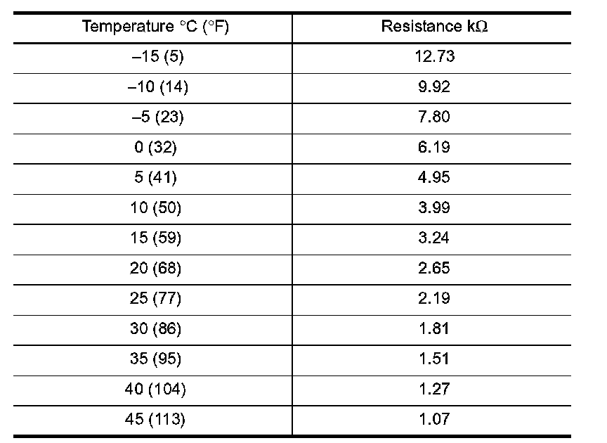 After disconnecting ambient sensor connector E62, measure resistance between terminals 1 and 2 at sensor side, using the table below.