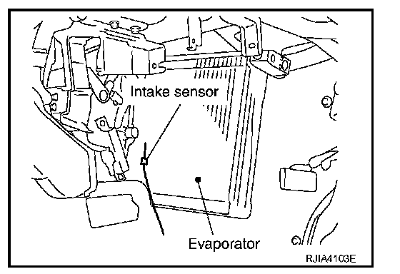 The intake sensor is located on the heater & cooling unit. It converts temperature of air after it passes through the evaporator into a resistance value which is then input to the unified meter and A/C amp.