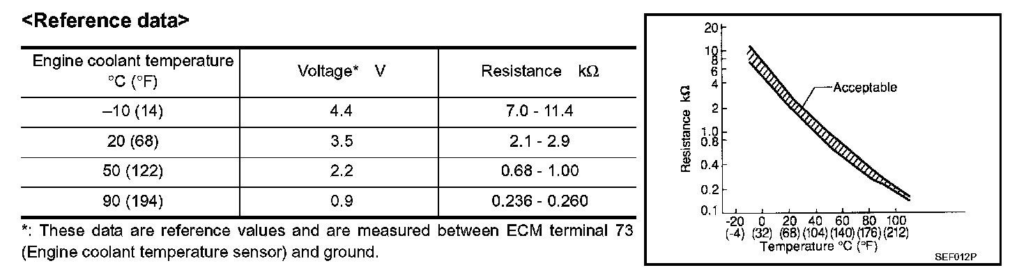 The engine coolant temperature sensor is used to detect the engine coolant temperature. The sensor modifies a voltage signal from the ECM. The modified signal returns to the ECM as the engine coolant temperature input. The sensor uses a thermistor which is sensitive to the change in temperature. The electrical resistance of the thermistor decreases as temperature increases.