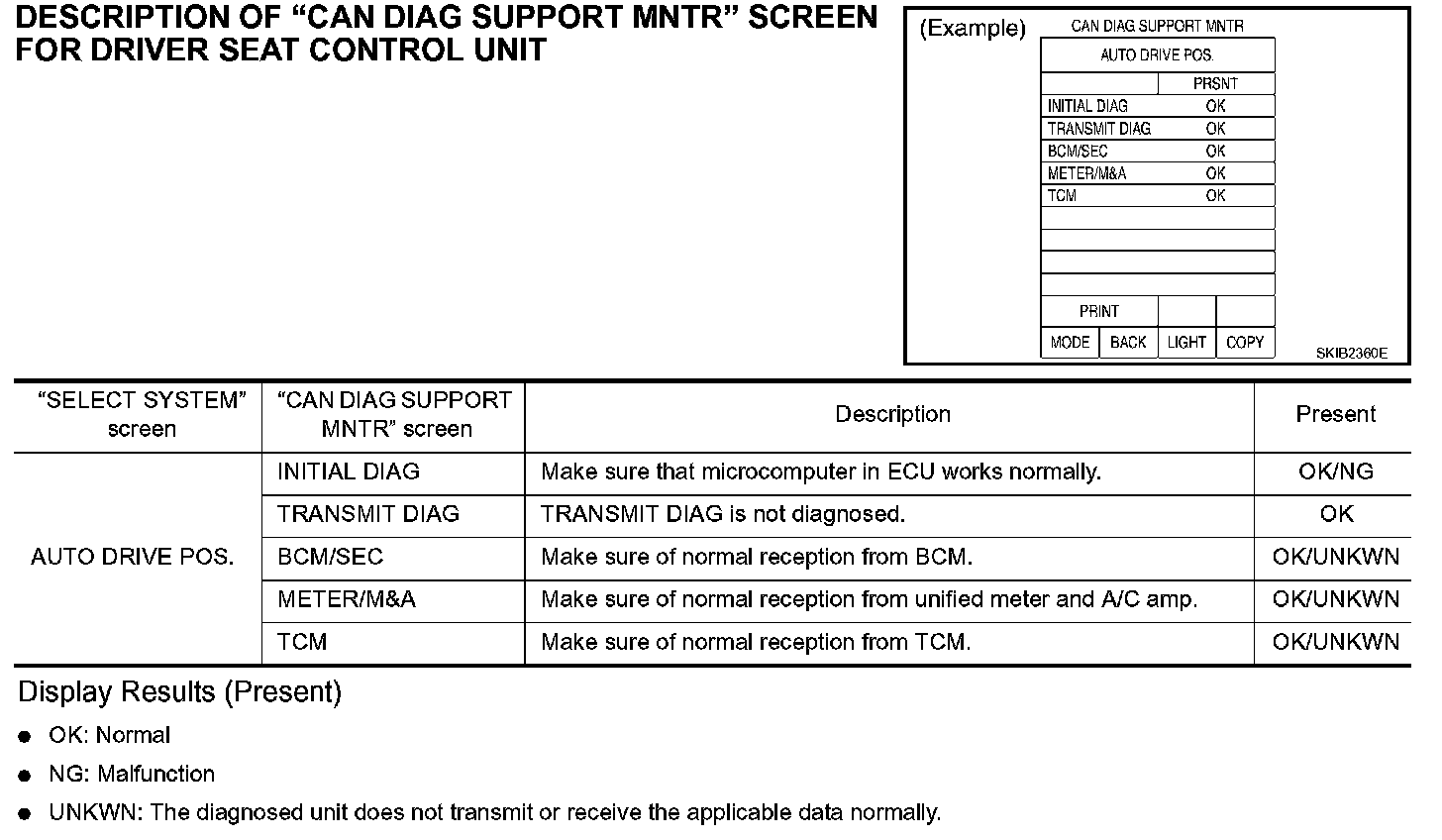 DESCRIPTION OF "CAN DIAG SUPPORT MNTR" SCREEN FOR DRIVER SEAT CONTROL UNIT