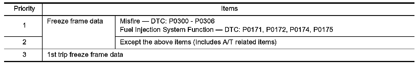 For example, the EGR malfunction (Priority: 2) was detected and the freeze frame data was stored in the 2nd trip. After that when the misfire (Priority: 1) is detected in another trip, the freeze frame data will be updated from the EGR malfunction to the misfire. The 1st trip freeze frame data is updated each time a different malfunction is detected. There is no priority for 1st trip freeze frame data. However, once freeze frame data is stored in the ECM memory, 1st trip freeze data is no longer stored (because only one freeze frame data or 1st trip freeze frame data can be stored in the ECM). If freeze frame data is stored in the ECM memory and freeze frame data with the same priority occurs later, the first (original) freeze frame data remains unchanged in the ECM memory.